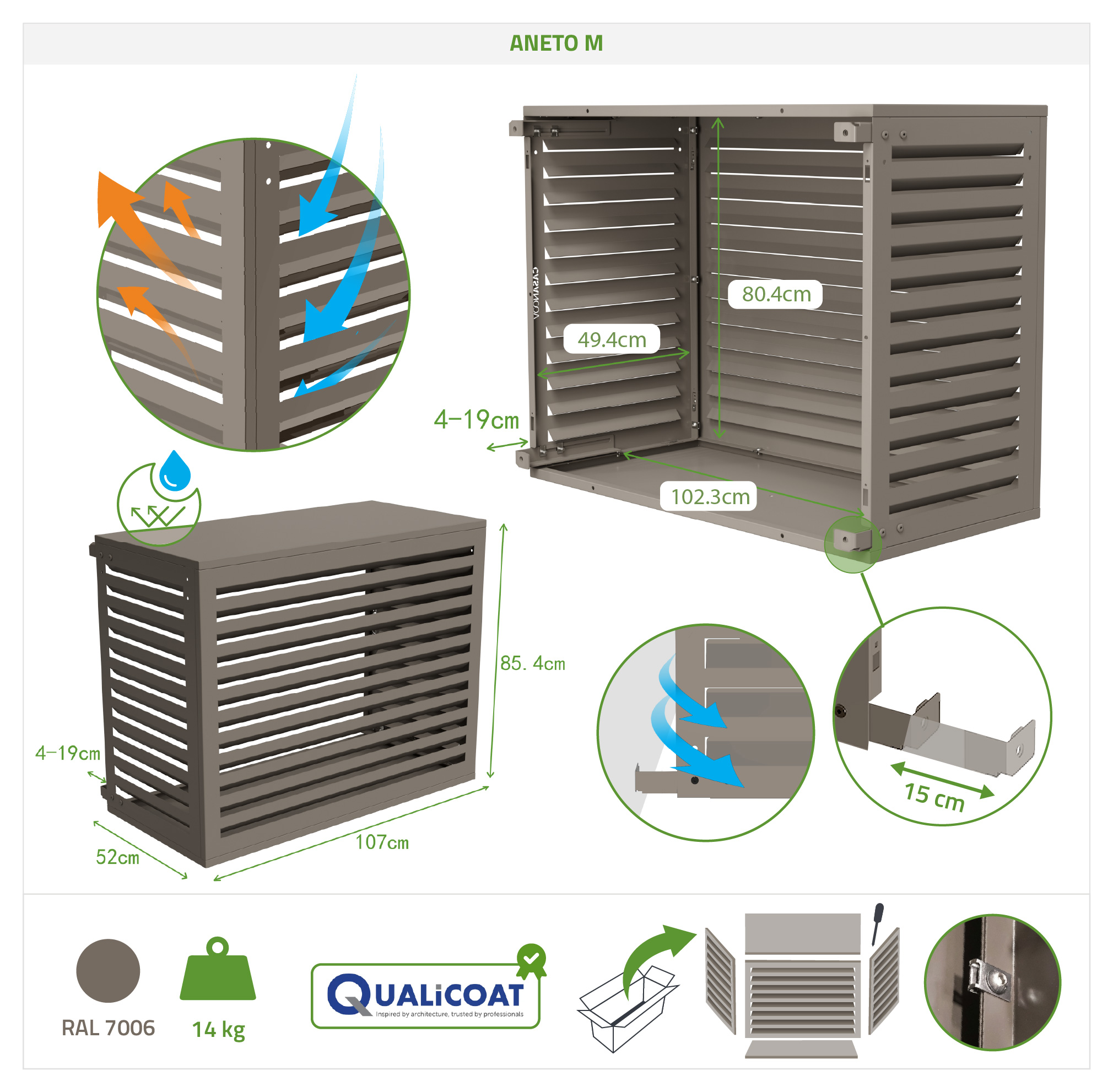 Hliníkový kryt klimatizace Aneto zaujme svým lamelovým designem, který nabízí diskrétní a elegantní kouzlo. Jeho hliníková konstrukce poskytuje elegantní povrchovou úpravu, pozoruhodnou lehkost a vynikající odolnost vůči povětrnostním vlivům, díky čemuž je ideální pro dlouhodobé venkovní použití. Integrovaná výztužná lišta na horní straně posiluje konstrukci a zajišťuje optimální tuhost a vynikající odolnost, obzvláště vhodná pro montáž na stěnu se spodním panelem.
