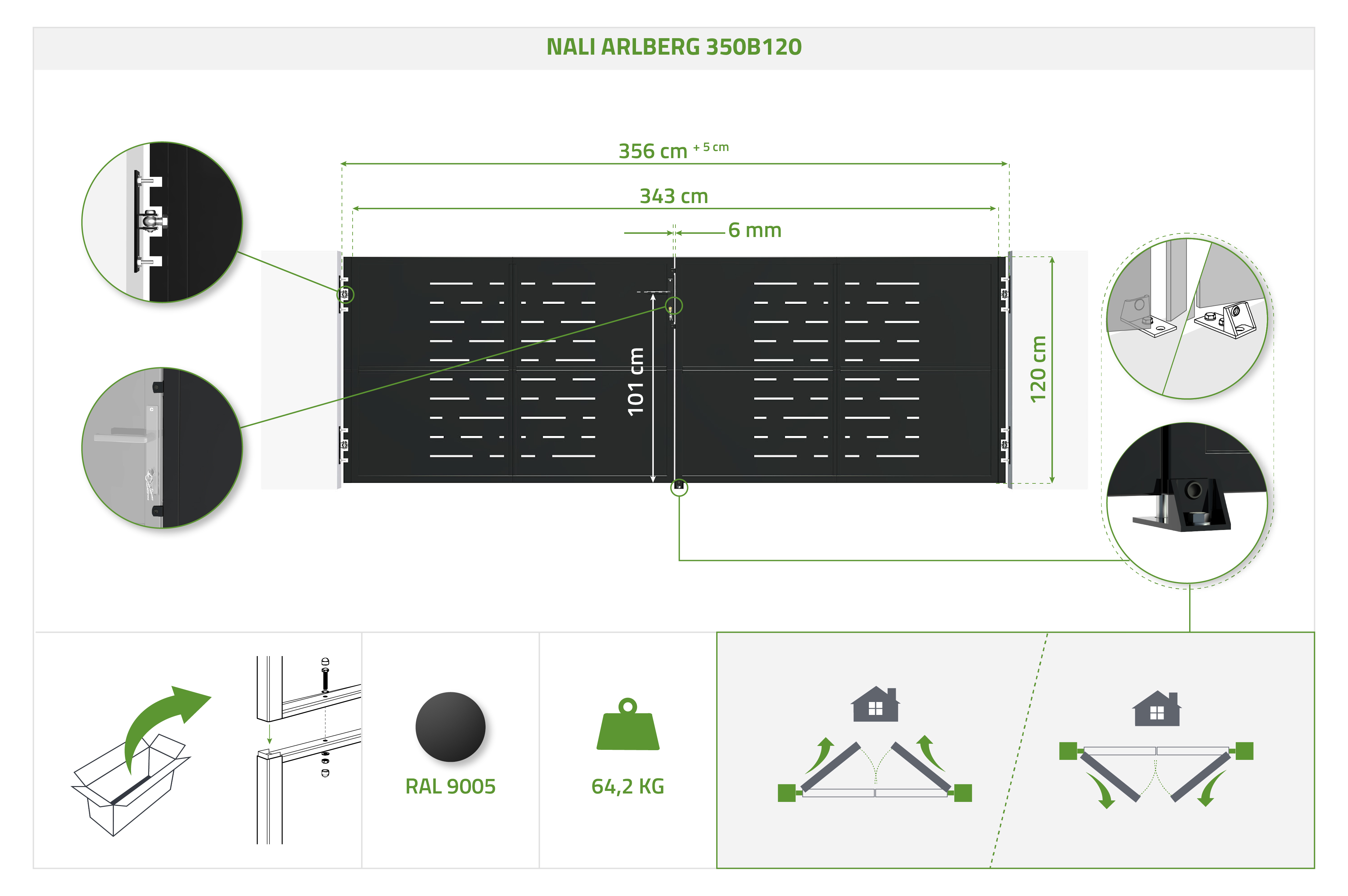 Matná černá ocelová brána 3,5 m NALI ARLBERG v. 120 cm